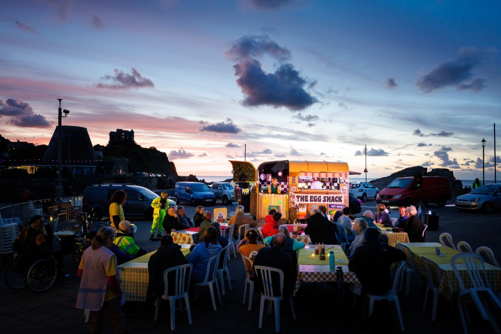 The Egg Shack – is the most recent Red Herring Production, commissioned by Landmark Theatres and presented as part of Red Herring’s Stepping Out Festival in Bideford and at the Landmark Welcome Weekender in August / September 2024. We started with conversations and workshops with community groups, facilitated through a partnership with Libraries Unlimited. For the show itself, audiences arrive in the warm and humorous setting of a street cafe. They meet the proprietor and her less than polished staff, played by a community cast, trained across a series of workshops. From here they are taken into the carpark, where they step inside or around a series of vehicles, meet some characters and dip into their lives. The show is a miscellany of experiences with a range of atmospheres, blending light and dark, extrovert and held, with the audience switching between roles and more passive positions. Each group sees a selection of the material and no-one sees it all. The result is rich and curious and the audience are brought together to chat about it over cups of tea and egg butties. While this show was a big hit with audiences, again there was little translation from community workshops to show attendance. This is an issue I wish to resolve now – to make sure that our work is as accessible as possible and succeeds in connecting with more people.